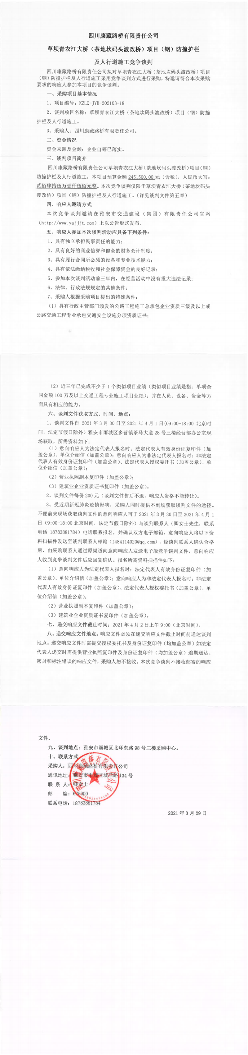 四川康藏路橋有限責(zé)任公司草壩青衣江大橋(茶地坎碼頭渡改橋)項目(鋼)防撞護(hù)欄及人行道施工競爭談判公告