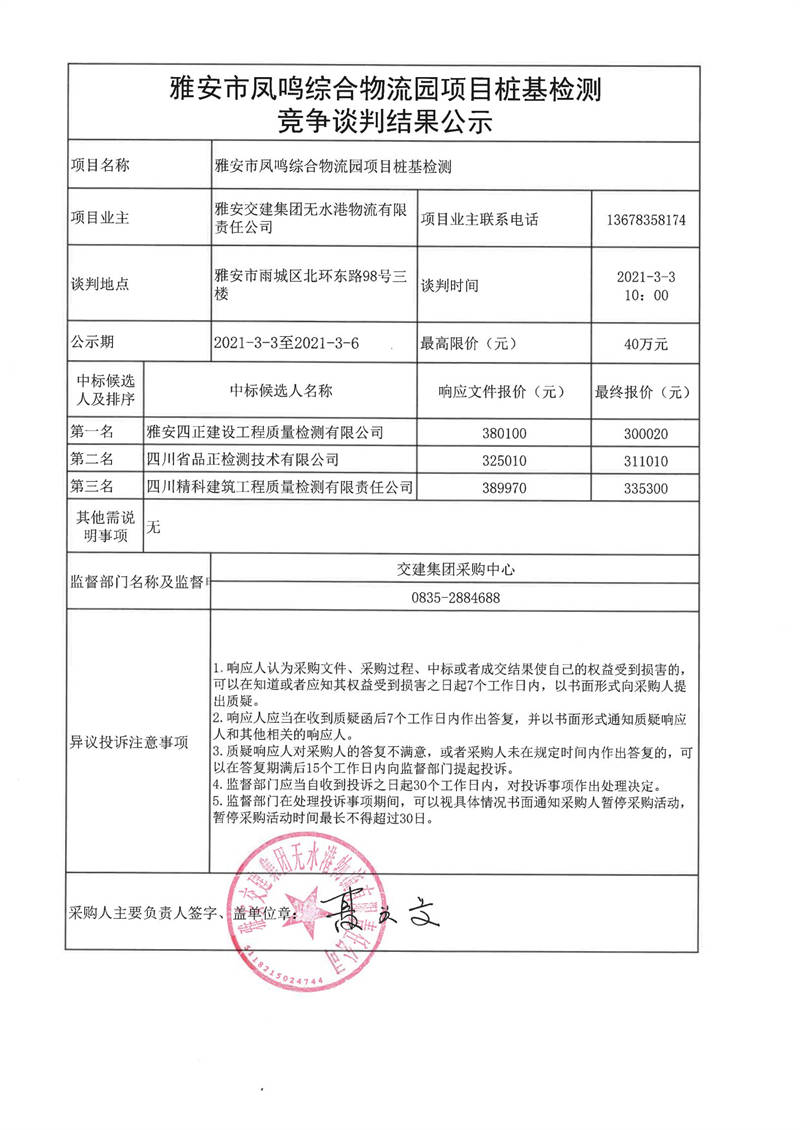 雅安交建集團無水港物流有限責任公司雅安市鳳鳴綜合物流園項目樁基檢測競爭談判結果公示