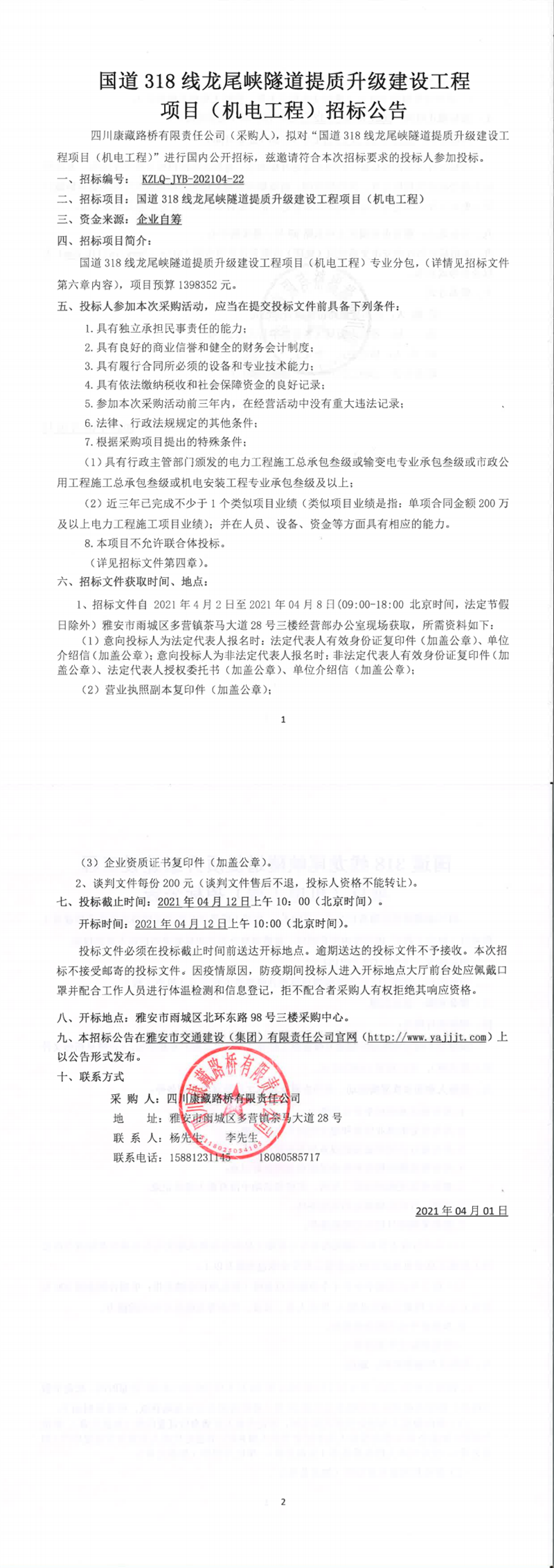 四川康藏路橋有限責任公司國道318線龍尾峽隧道提質升級建設工程項目(機電工程)招標公告