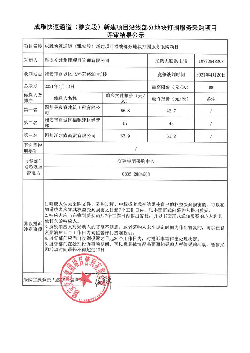 雅安交建集團(tuán)項(xiàng)目管理有限公司成雅快速通道(雅安段)新建項(xiàng)目沿線部分地塊打圍服務(wù)采購(gòu)項(xiàng)目評(píng)審結(jié)果公示