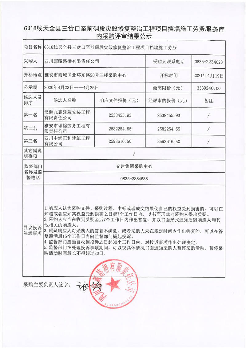 四川康藏路橋有限責任公司G318線天全縣三岔口至前碉段災(zāi)毀修復整治工程項目擋墻施工勞務(wù)服務(wù)庫內(nèi)采購評審結(jié)果公示