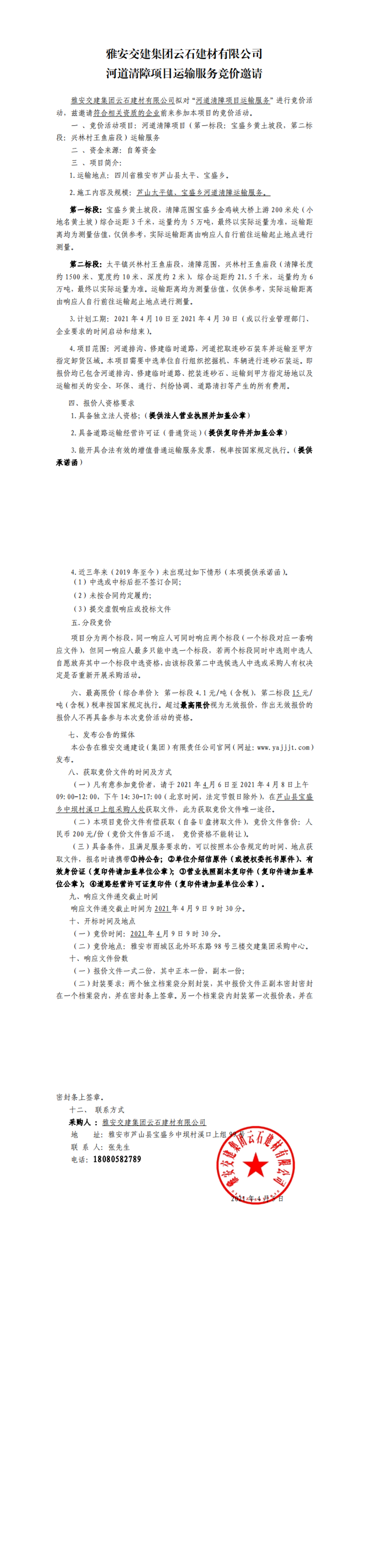 雅安交建集團云石建材有限公司河道清障項目運輸服務競價公告