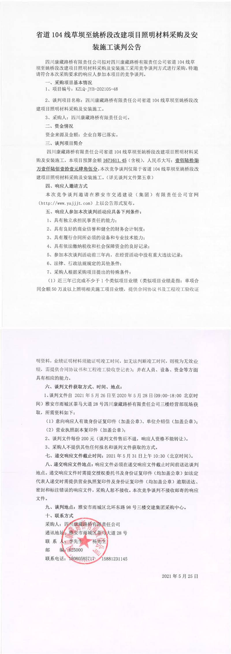 四川康藏路橋有限責任公司省道104線草壩至姚橋段改建項目照明材料采購及安裝施工談判公告