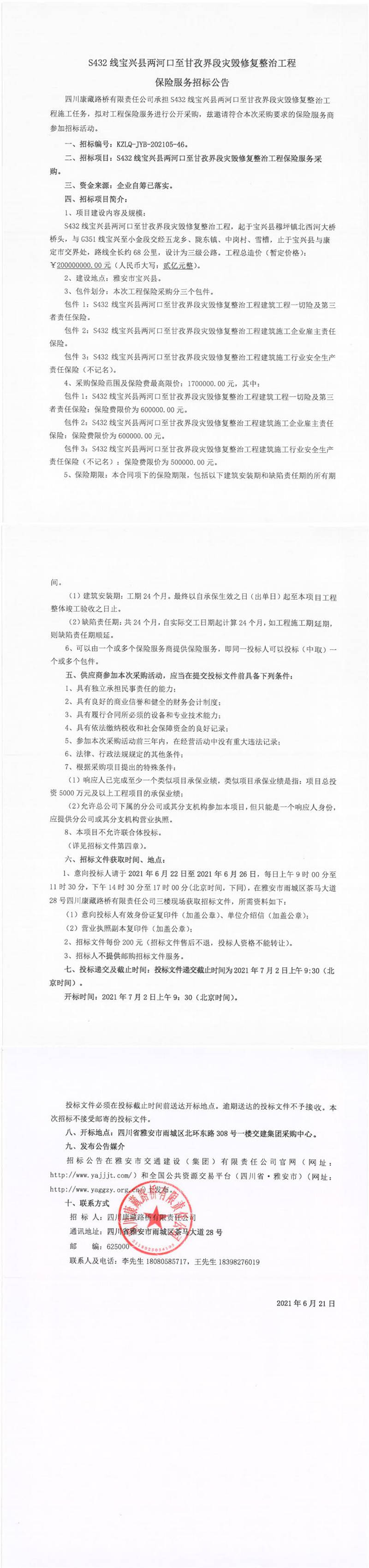 四川康藏路橋有限責(zé)任公司S432線寶興縣兩河口至甘孜界段災(zāi)毀修復(fù)整治工程保險(xiǎn)服務(wù)招標(biāo)公告