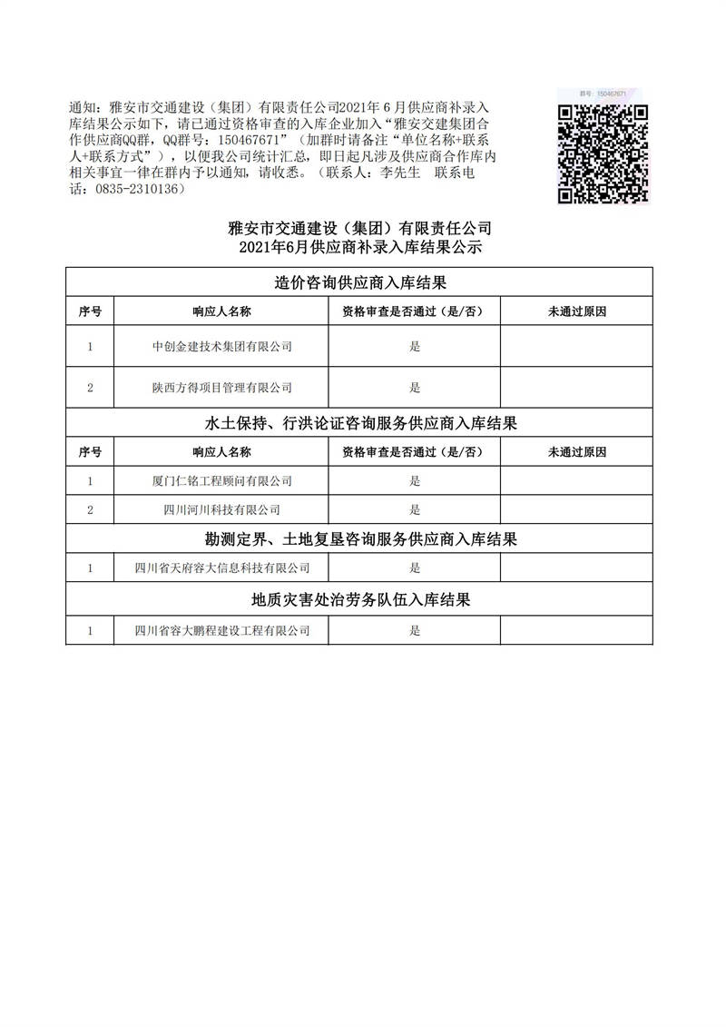 雅安市交通建設(shè)(集團)有限責任公司2021年6月供應商補錄入庫結(jié)果公示