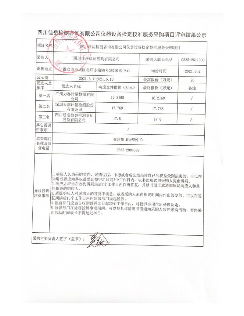 四川佳岳檢測咨詢有限公司儀器設(shè)備檢定校準服務(wù)采購項目評審結(jié)果公示