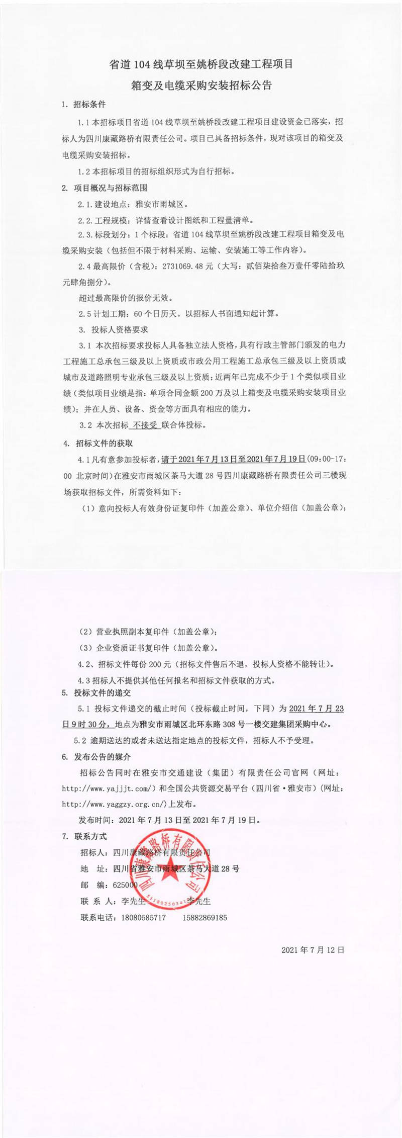 四川康藏路橋有限責(zé)任公司省道104線草壩至姚橋段改建項目箱變及電纜采購安裝招標(biāo)公告