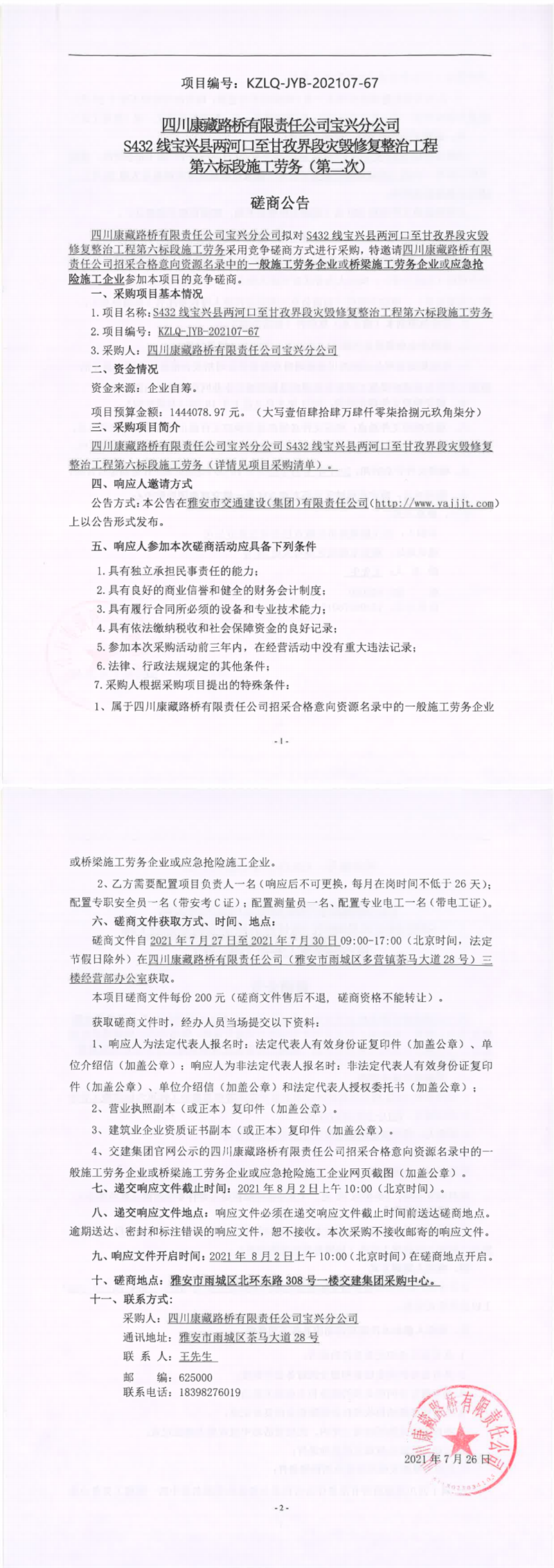 四川康藏路橋有限責(zé)任公司S432線寶興縣兩河口至甘孜界段災(zāi)毀修復(fù)整治工程第六標(biāo)段施工勞務(wù)(第二次)競(jìng)爭(zhēng)磋商公告