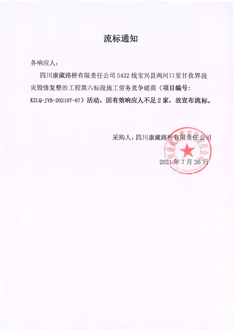 四川康藏路橋有限責(zé)任公司S432線寶興縣兩河口至甘孜界段災(zāi)毀修復(fù)整治工程第六標(biāo)段施工勞務(wù)競爭磋商流標(biāo)通知