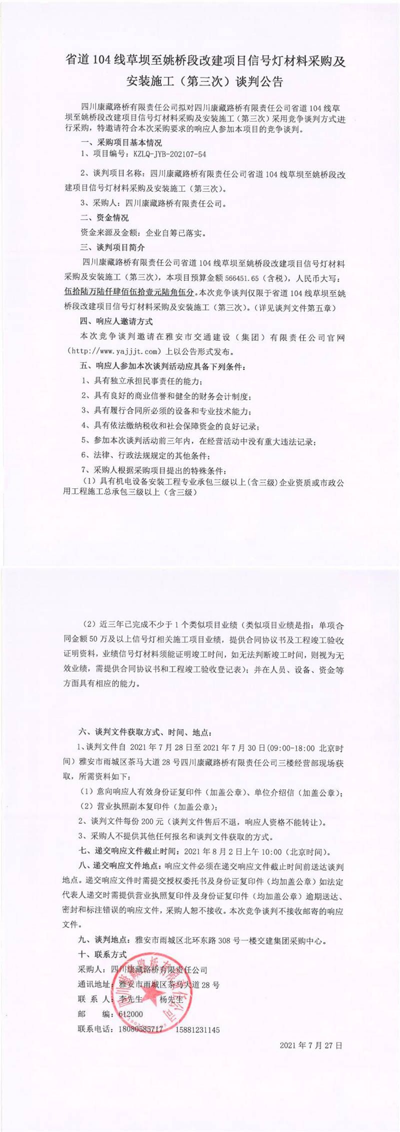 四川康藏路橋有限責(zé)任公司省道104線草壩至姚橋段改建項目信號燈材料采購及安裝施工(第三次)談判公告