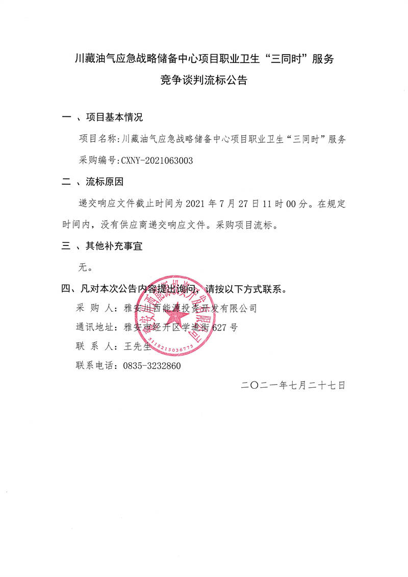 雅安川西能源投資開發(fā)有限公司川藏油氣應(yīng)急戰(zhàn)略儲備中心項(xiàng)目職業(yè)衛(wèi)生“三同時”服務(wù)競爭談判流標(biāo)公告