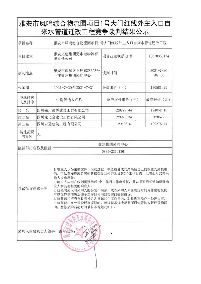 雅安交建集團無水港物流有限責(zé)任公司雅安市鳳鳴綜合物流園項目1號大門紅線外主入口自來水管道遷改工程競爭談判結(jié)果公示