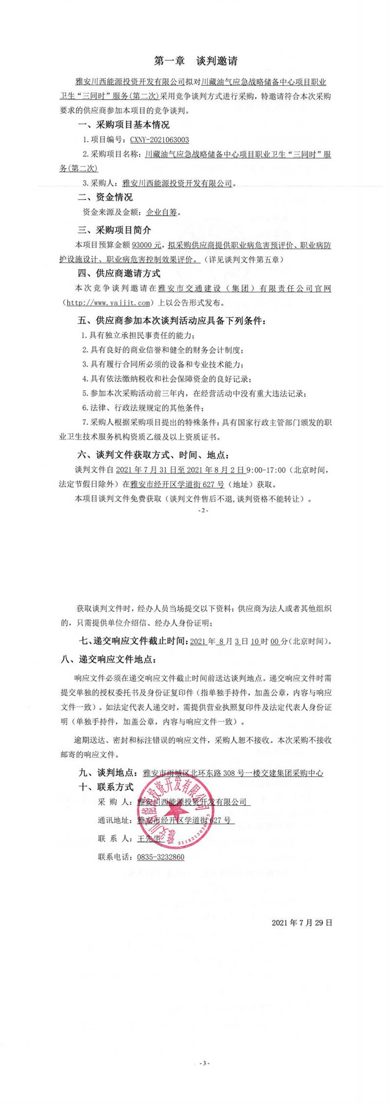 雅安川西能源投資開發(fā)有限公司川藏油氣應(yīng)急戰(zhàn)略儲備中心項目職業(yè)衛(wèi)生“三同時”服務(wù)(第二次)競爭談判公告