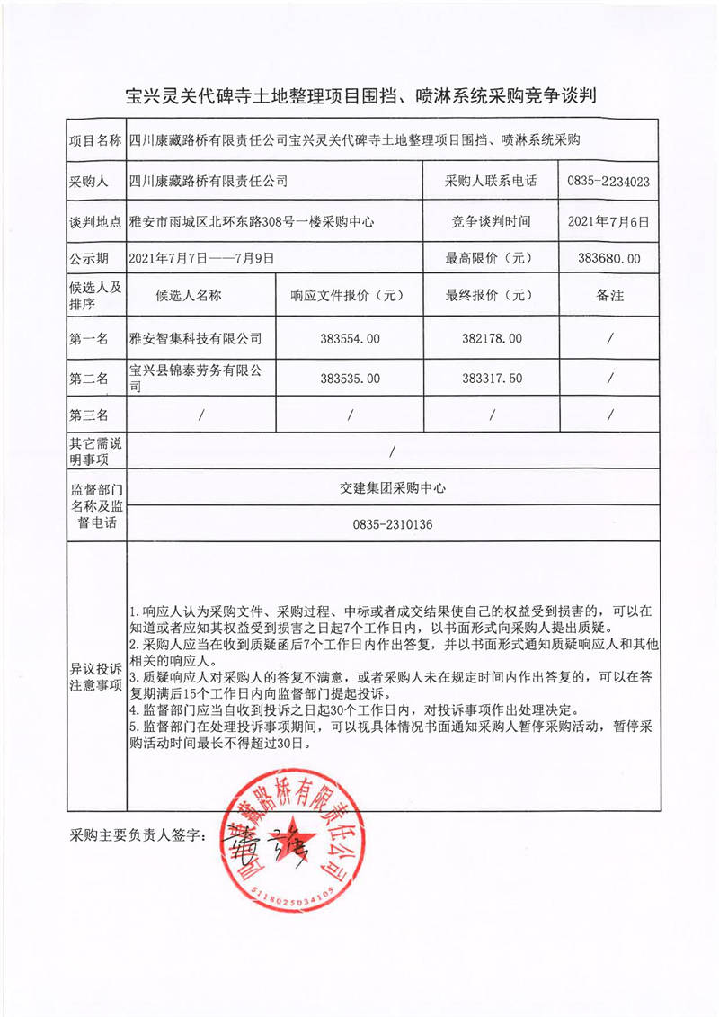 四川康藏路橋有限責任公司寶興靈關(guān)代碑寺土地整理工程項目圍擋、噴淋系統(tǒng)采購競爭談判結(jié)果公示