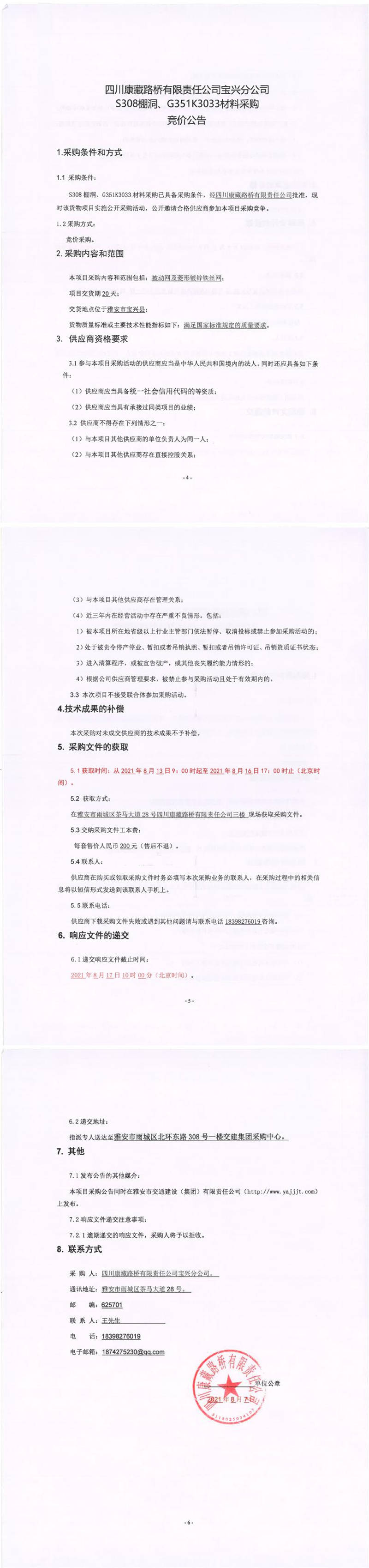 四川康藏路橋有限責任公司寶興分公司S308棚洞、G351K3033材料采購競價公告