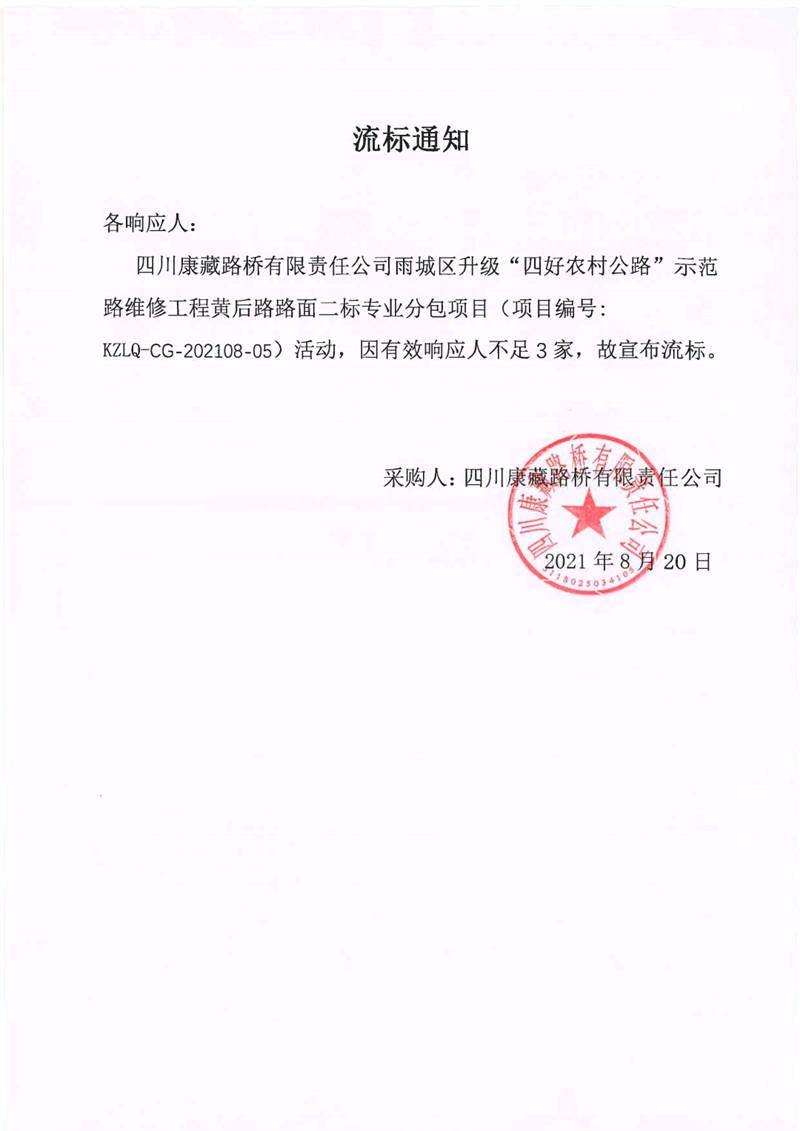 四川康藏路橋有限責(zé)任公司雨城區(qū)升級(jí)“四好農(nóng)村公路”示范路維修工程黃后路路面二標(biāo)專(zhuān)業(yè)分包項(xiàng)目流標(biāo)通知