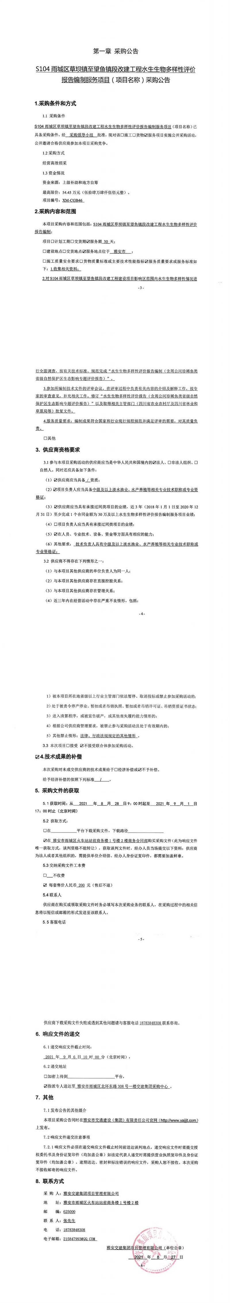 雅安交建集團項目管理有限公司S104雨城區(qū)草壩鎮(zhèn)至望魚鎮(zhèn)段改建工程水生生物多樣性評價報告編制服務項目采購公告