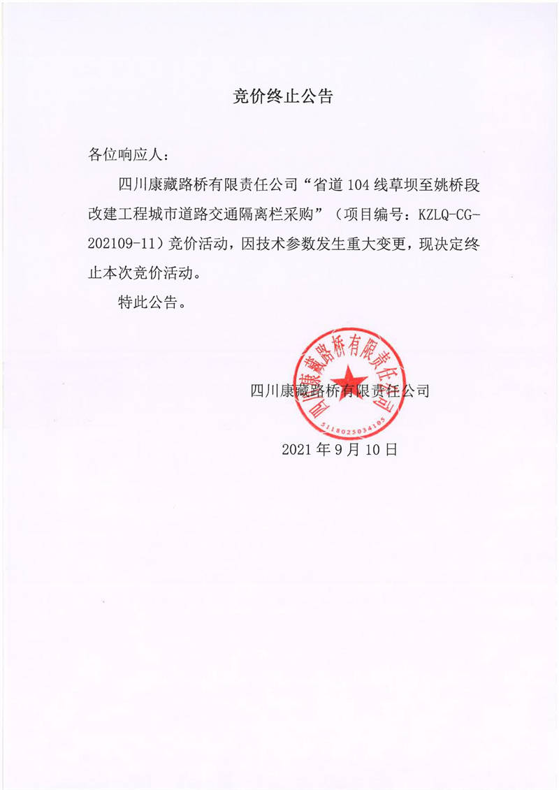 四川康藏路橋有限責(zé)任公司省道104線草壩至姚橋段改建工程城市道路交通隔離欄采購競價(jià)終止公告