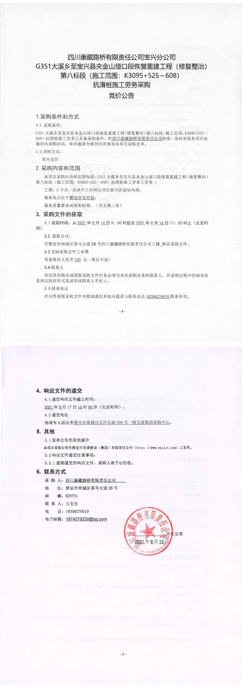 四川康藏路橋有限責(zé)任公司寶興分公司G351大溪鄉(xiāng)至寶興縣夾金山埡口段恢復(fù)重建工程(修復(fù)整治)第八標(biāo)段(施工范圍:K3095+525-608)抗滑樁施工勞務(wù)采購競價(jià)公告