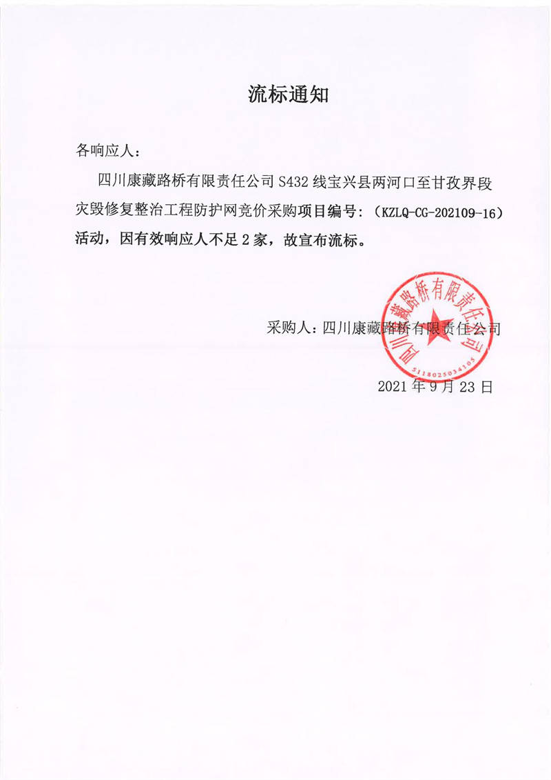 四川康藏路橋有限責(zé)任公司S432線寶興縣兩河口至甘孜界段災(zāi)毀修復(fù)整治工程防護網(wǎng)采購流標通知