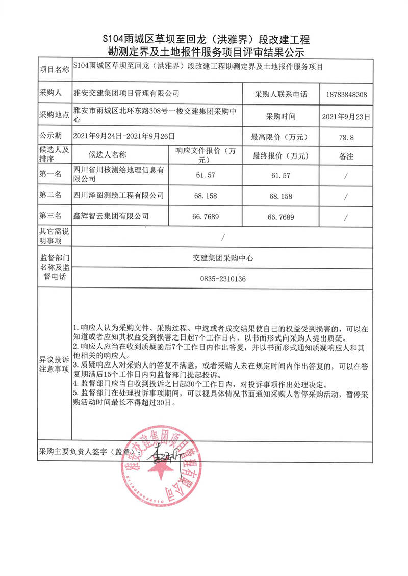 雅安交建集團項目管理有限公司S104雨城區(qū)草壩至回龍(洪雅界)段改建工程勘測定界及土地報件服務項目評審結果公示