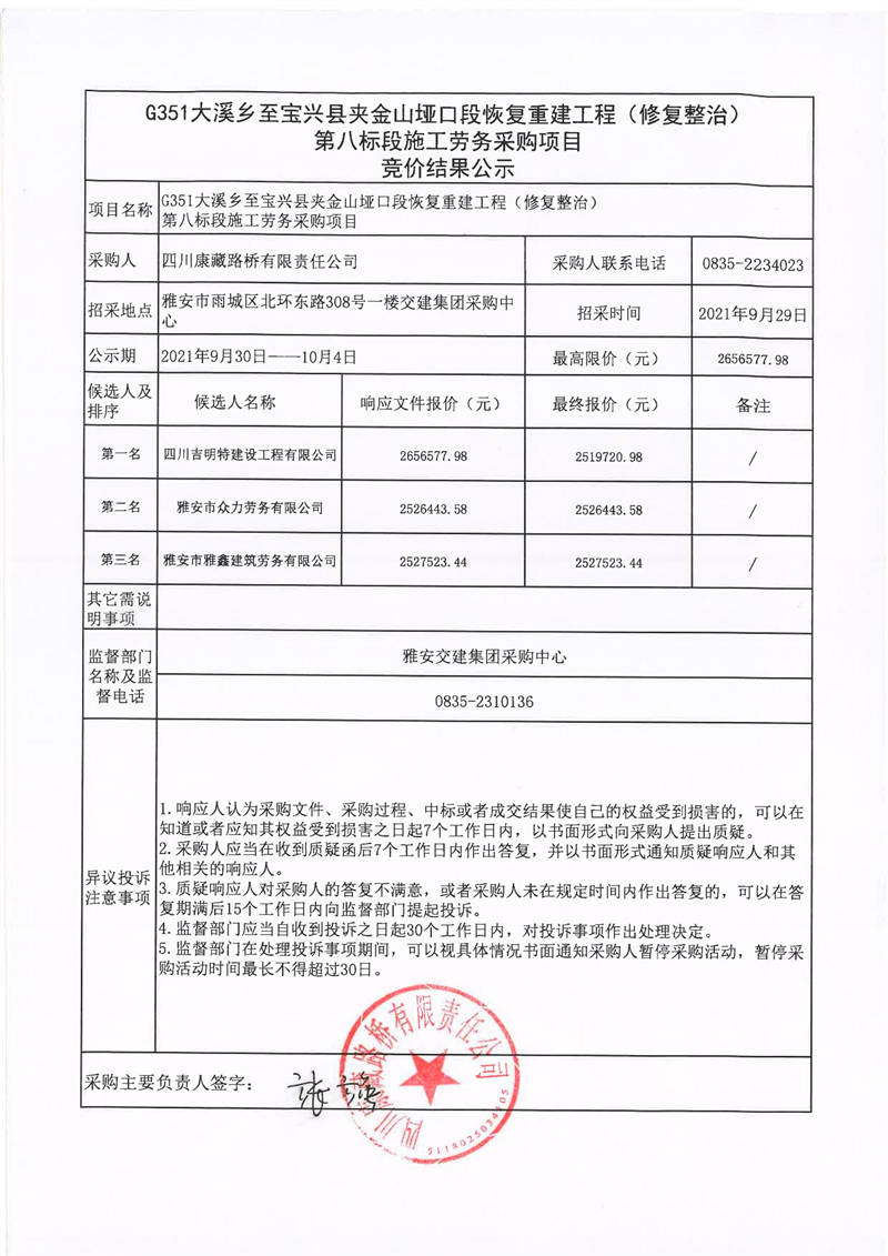 四川康藏路橋有限責(zé)任公司G351大溪鄉(xiāng)至寶興縣夾金山埡口段恢復(fù)重建工程(修復(fù)整治)第八標(biāo)段施工勞務(wù)采購項(xiàng)目競(jìng)價(jià)結(jié)果公示