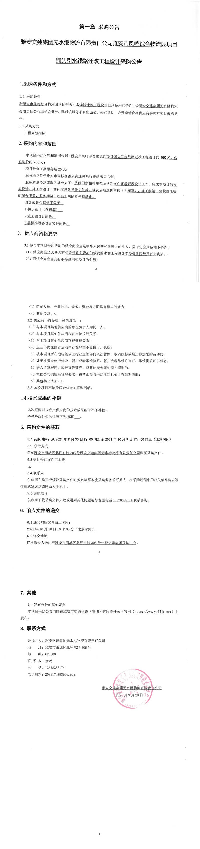 雅安交建集團(tuán)無水港物流有限責(zé)任公司雅安市鳳鳴綜合物流園項(xiàng)目銅頭引水線路遷改工程設(shè)計采購公告