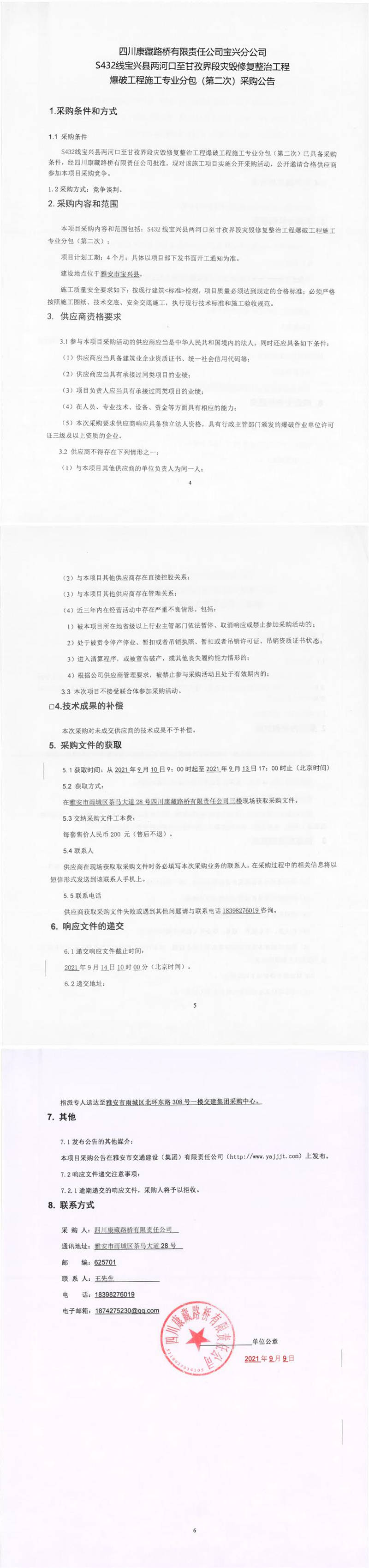 四川康藏路橋有限責任公司S432線寶興縣兩河口至甘孜界段災(zāi)毀修復(fù)整治工程爆破工程施工專業(yè)分包(第二次)采購公告