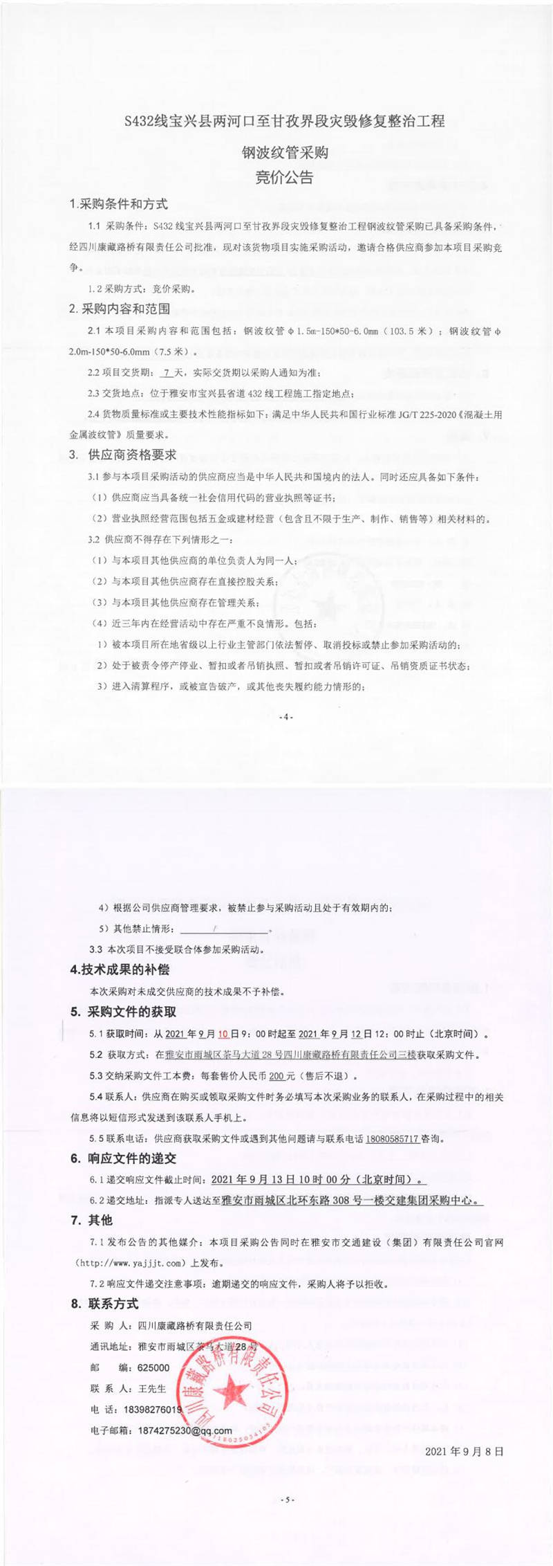 四川康藏路橋有限責任公司S432線寶興縣兩河口至甘孜界段災(zāi)毀修復(fù)整治工程鋼波紋管采購競價公告
