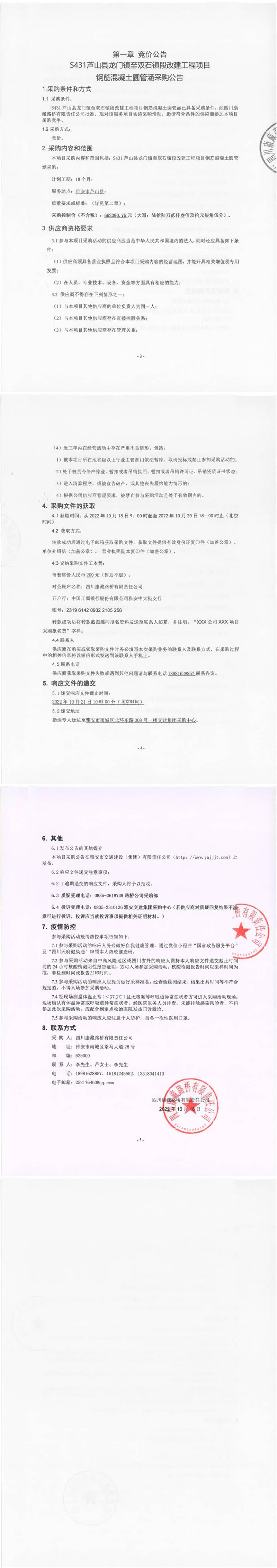 四川康藏路橋有限責(zé)任公司S431蘆山縣龍門鎮(zhèn)至雙石鎮(zhèn)段改建工程項(xiàng)目鋼筋混凝土圓管涵采購公告