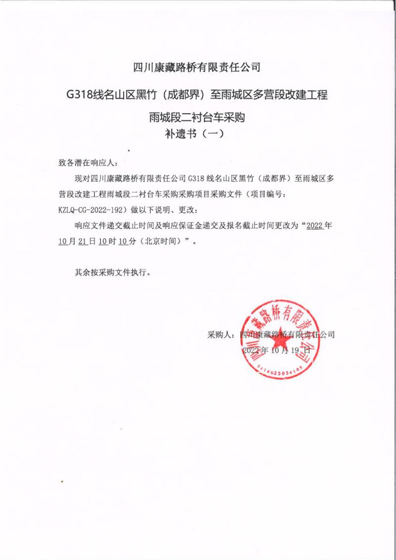 四川康藏路橋有限責(zé)任公司G318線名山區(qū)黑竹(成都界)至雨城區(qū)多營(yíng)段改建工程雨城段二襯臺(tái)車采購補(bǔ)遺書(一)