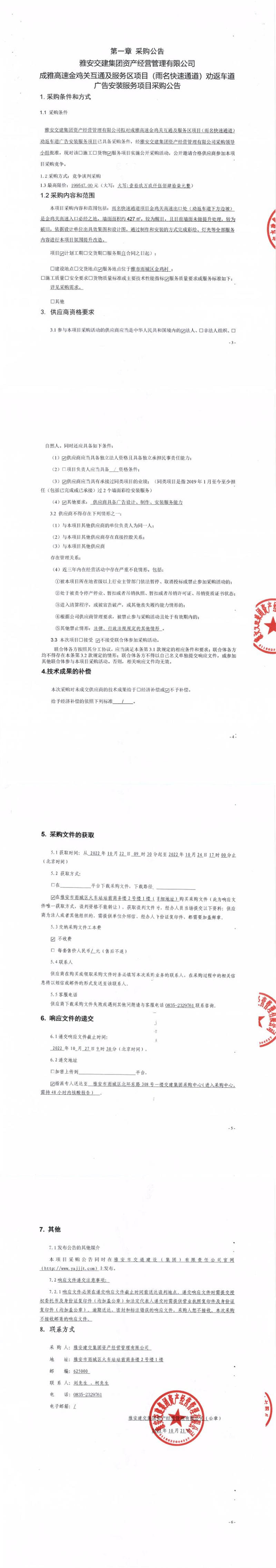 雅安交建集團資產經營管理有限公司成雅高速金雞關互通及服務區(qū)項目(雨名快速通道)勸返車道廣告安裝服務項目采購公告