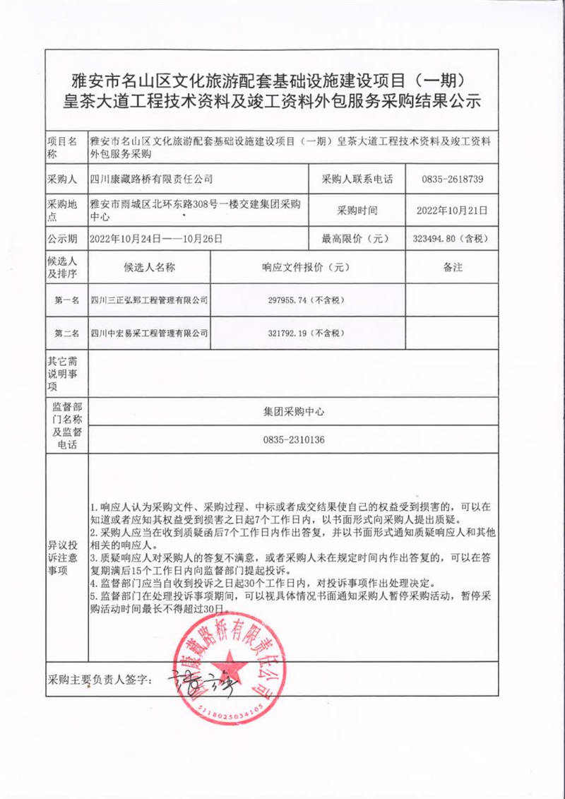 四川康藏路橋有限責任公司雅安市名山區(qū)文化旅游配套基礎設施建設項目(一期)皇茶大道工程技術資料及竣工資料外包服務采購結果公示