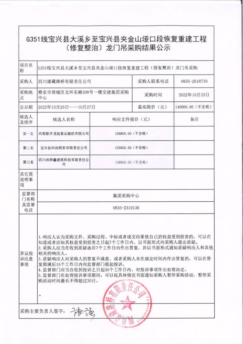 四川康藏路橋有限責任公司G351線寶興縣大溪鄉(xiāng)至寶興縣夾金山埡口段恢復重建工程(修復整治)龍門吊采購結(jié)果公示