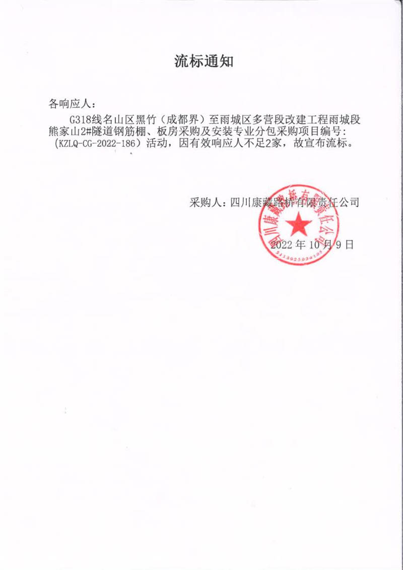 四川康藏路橋有限責(zé)任公司G318線名山區(qū)黑竹(成都界)至雨城區(qū)多營段改建工程雨城段熊家山2#隧道鋼筋棚、板房采購及安裝專業(yè)分包采購項(xiàng)目流標(biāo)通知