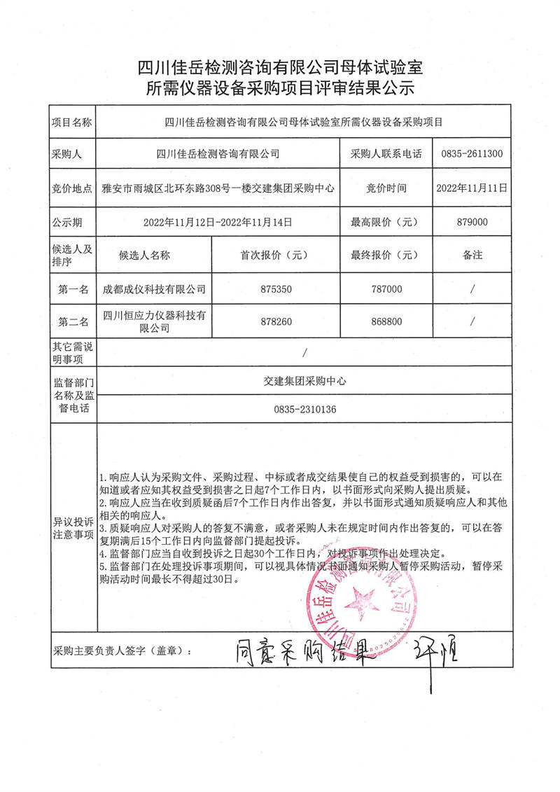 四川佳岳檢測咨詢有限公司母體試驗(yàn)室所需儀器設(shè)備采購項(xiàng)目評(píng)審結(jié)果公示
