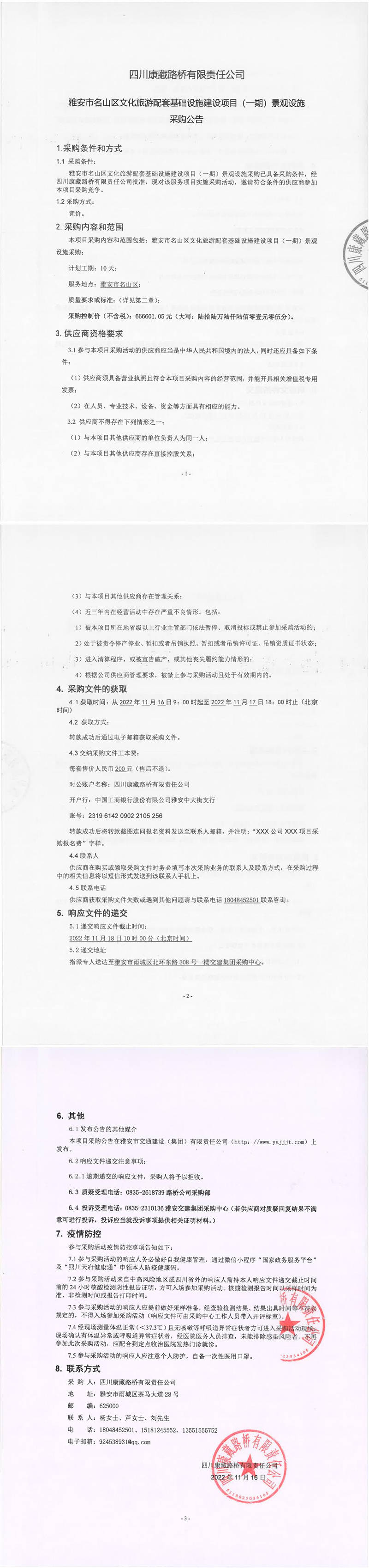 四川康藏路橋有限責任公司雅安市名山區(qū)文化旅游配套基礎設施建設項目(一期)景觀設施采購公告