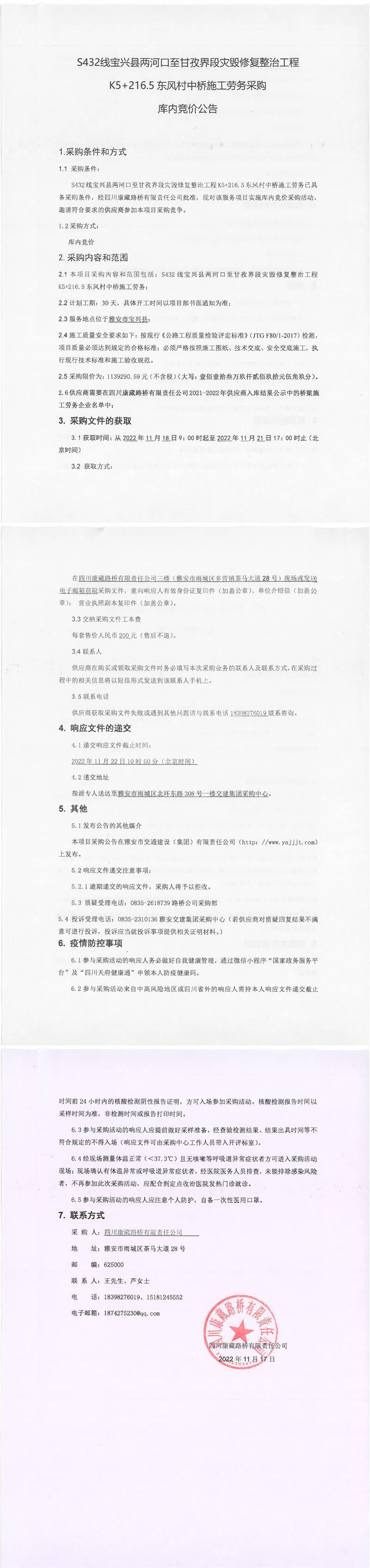 四川康藏路橋有限責(zé)任公司S432線寶興縣兩河口至甘孜界段災(zāi)毀修復(fù)整治工程K5+216.5東風(fēng)村中橋施工勞務(wù)采購庫內(nèi)競價公告