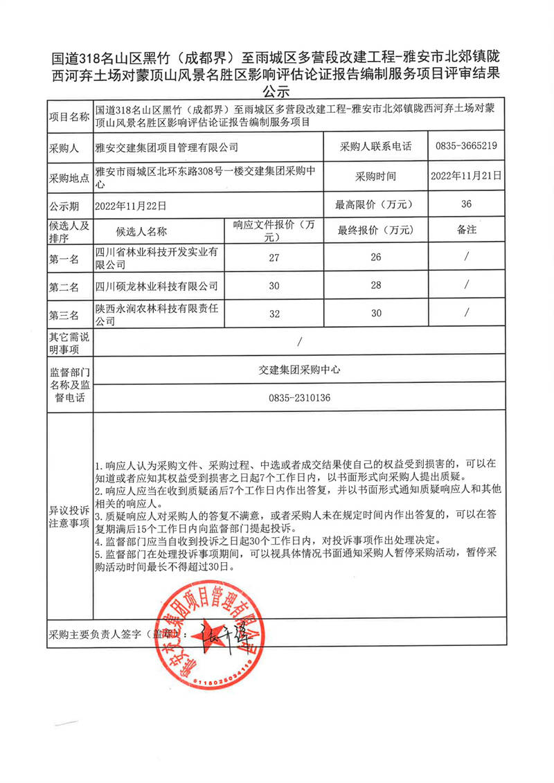 雅安交建集團(tuán)項目管理有限公司國道318名山區(qū)黑竹(成都界)至雨城區(qū)多營段改建工程-雅安市北郊鎮(zhèn)隴西河棄土場對蒙頂山風(fēng)景名勝區(qū)影響評估論證報告編制服務(wù)評審結(jié)果公示