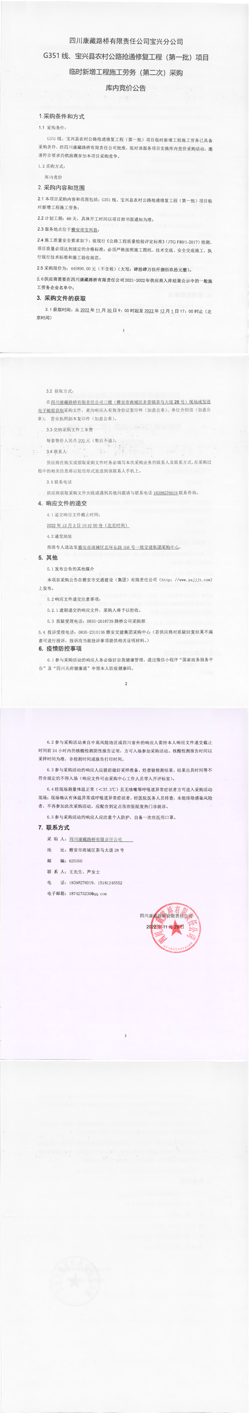 四川康藏路橋有限責任公司G351線、寶興縣農村公路搶通修復工程(第一批)項目臨時新增工程施工勞務(第二次)采購庫內競價公告