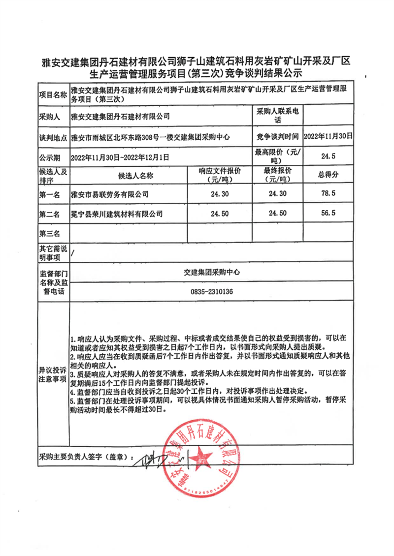 雅安交建集團(tuán)丹石建材有限公司獅子山建筑石料用灰?guī)r礦礦山開采及廠區(qū)生產(chǎn)運(yùn)營管理服務(wù)項(xiàng)目(第三次)競爭談判結(jié)果公示