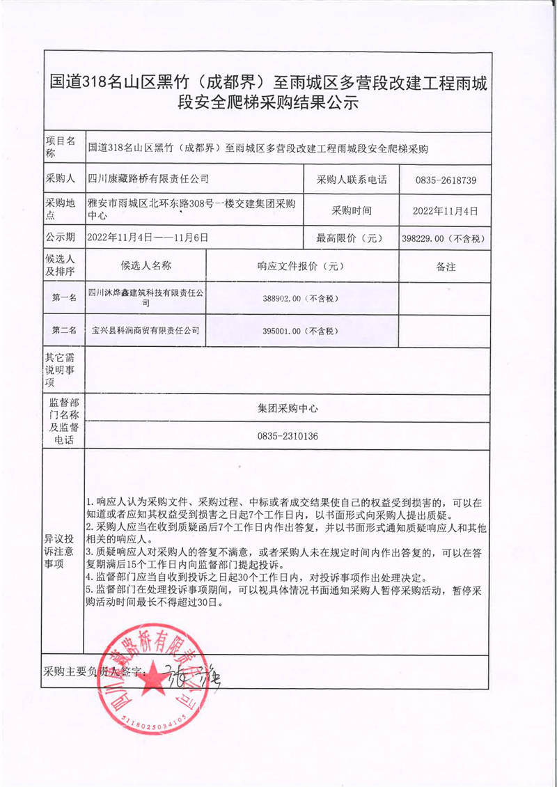 四川康藏路橋有限責任公司國道318名山區(qū)黑竹(成都界)至雨城區(qū)多營段改建工程雨城段安全爬梯采購結(jié)果公示