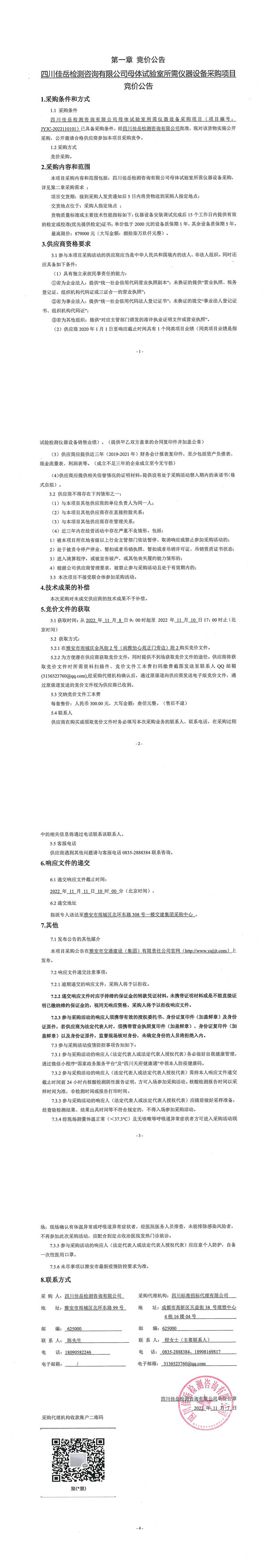 四川佳岳檢測咨詢有限公司母體試驗室所需儀器設(shè)備采購項目采購公告