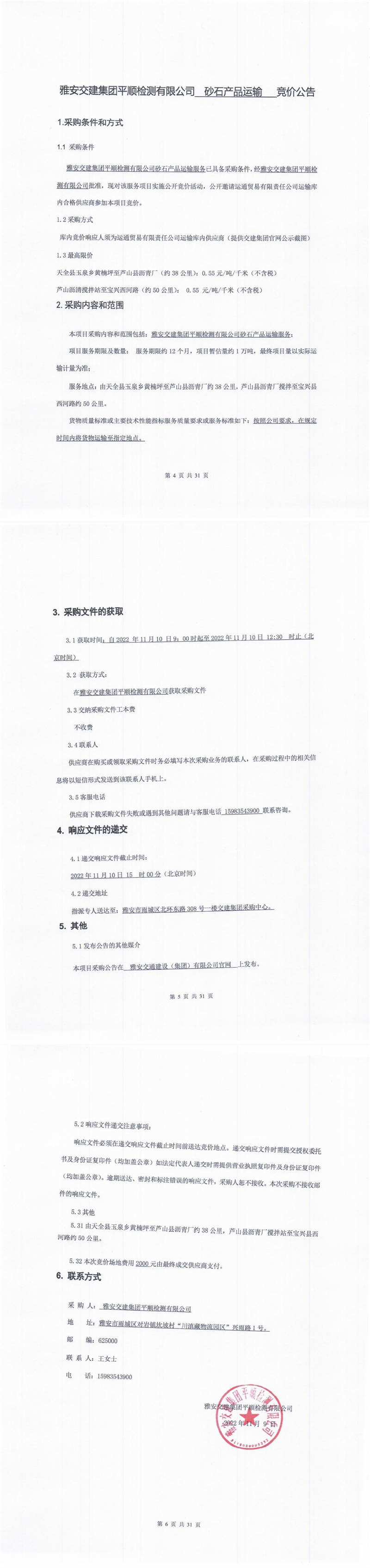 雅安交建集團平順檢測有限公司砂石產(chǎn)品運輸競價公告