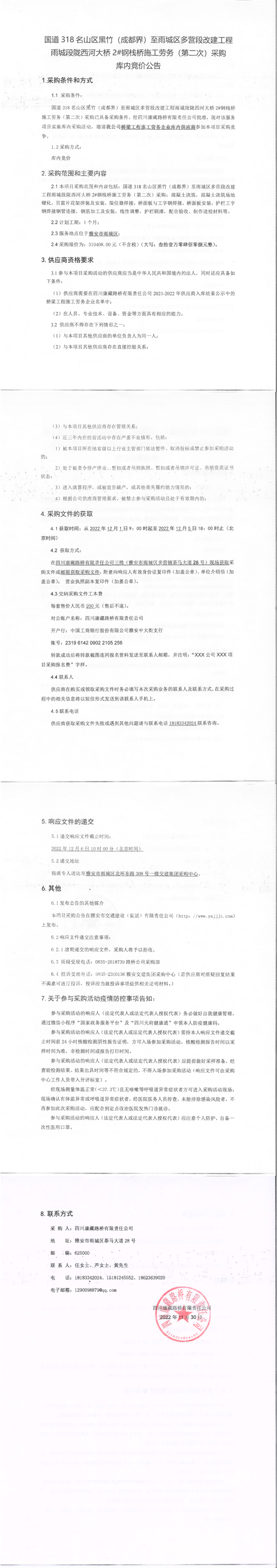 四川康藏路橋有限責(zé)任公司國道318名山區(qū)黑竹(成都界)至雨城區(qū)多營段改建工程雨城段隴西河大橋2#鋼棧橋施工勞務(wù)(第二次)采購庫內(nèi)競(jìng)價(jià)公告