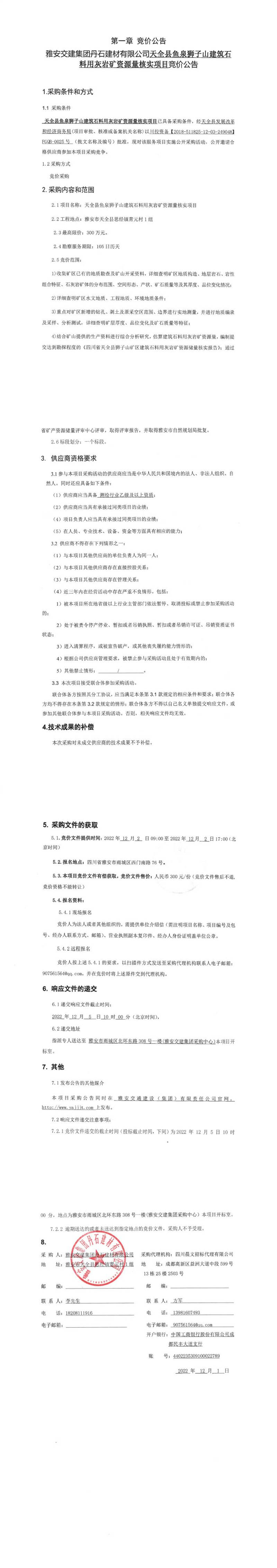 雅安交建集團(tuán)丹石建材有限公司天全縣魚泉獅子山建筑石料用灰?guī)r礦資源量核實(shí)項(xiàng)目競(jìng)價(jià)公告