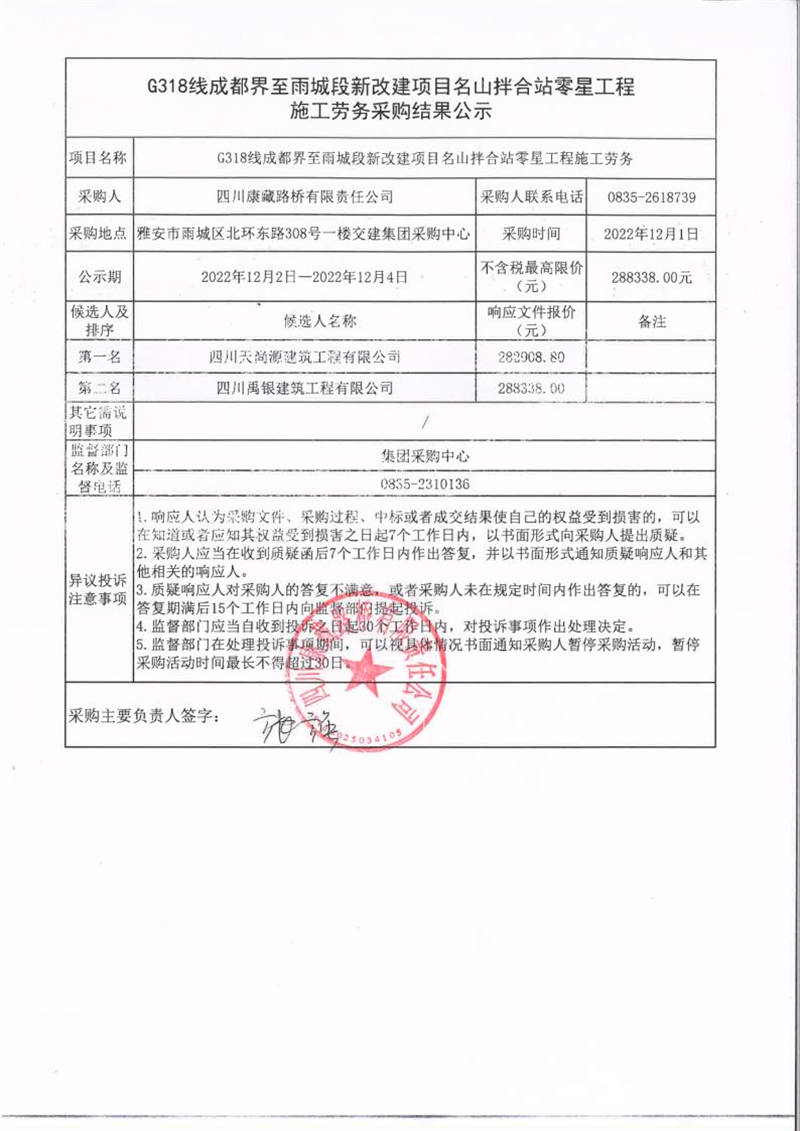 四川康藏路橋有限責(zé)任公司G318線成都界至雨城段新改建項目名山拌合站零星工程施工勞務(wù)采購結(jié)果公示