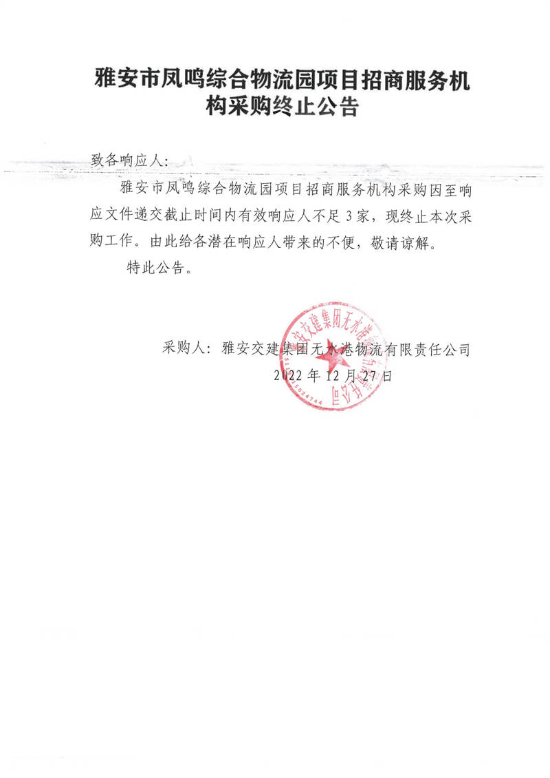 雅安交建集團無水港物流有限責任公司雅安市鳳鳴綜合物流園項目招商服務(wù)機構(gòu)采購終止公告