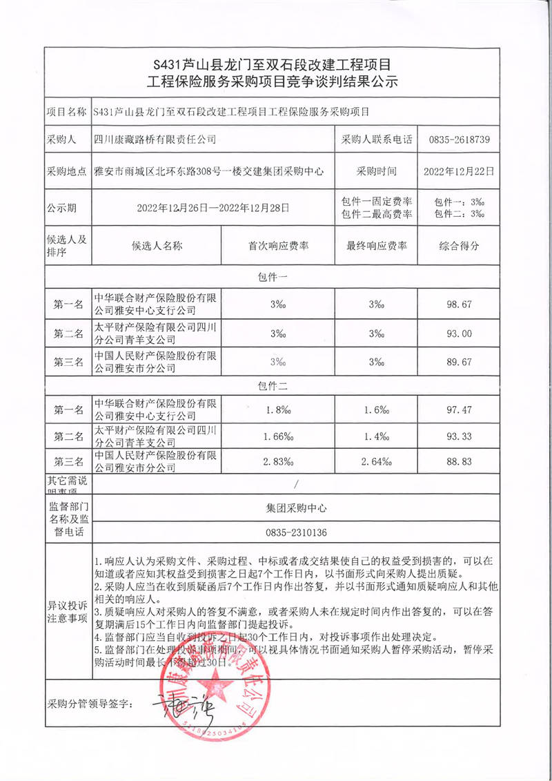 四川康藏路橋有限責任公司S431蘆山縣龍門至雙石段改建工程項目工程保險服務采購項目競爭談判結果公示