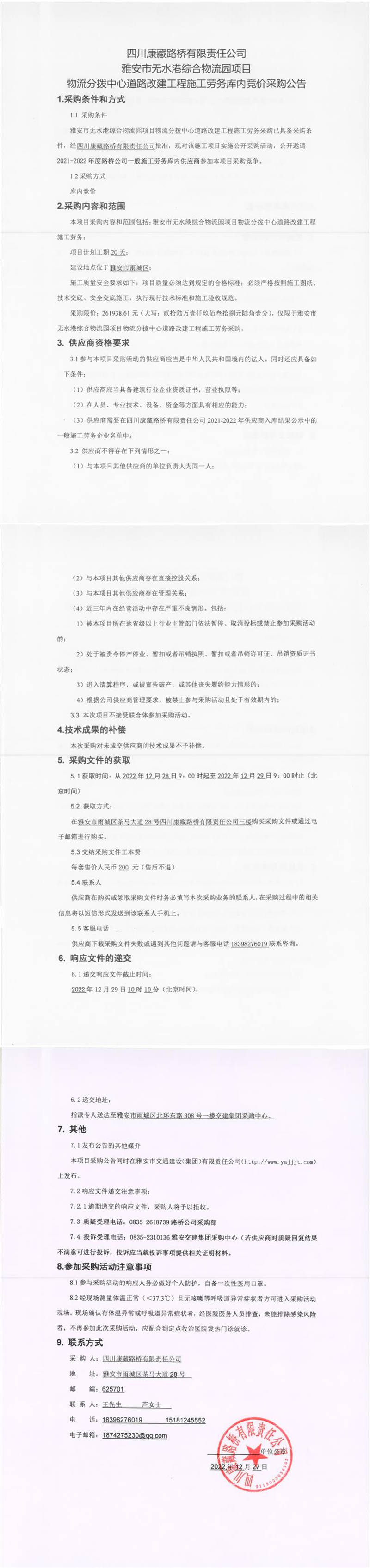四川康藏路橋有限責(zé)任公司雅安市無水港綜合物流園項(xiàng)目物流分撥中心道路改建工程施工勞務(wù)庫內(nèi)競(jìng)價(jià)采購(gòu)公告
